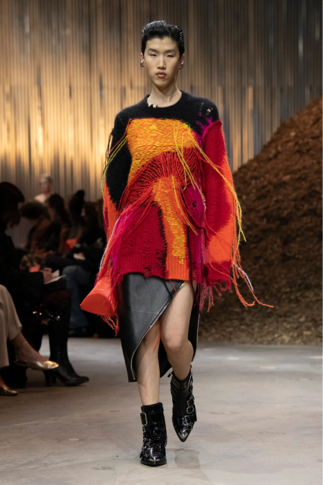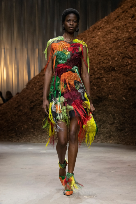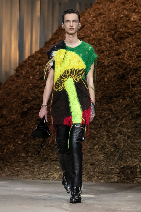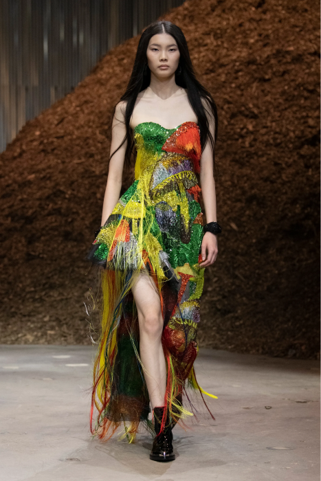 В виде грибов сделана вышивка на платьях, сам мицелий изображен с помощью длинной шелковой бахромы. Палитра брючных костюмов повторяет психоделические оттенки ядовитых грибов: кислотно-зеленый, желтый, красный. Также есть кожаные плащи, строгие пальто и костюмы с разбрызганной краской, вдохновленные знаменитым показом Маккуина 1999 года с Шалом Харлоу и роботами. Отмечается, что коллекция на 85% состоит из устойчивых материалов, которые можно будет переработать.
