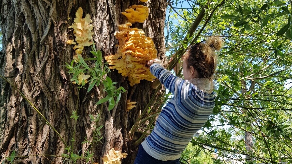 Ярко-жёлтые грибы надо аккуратно срезать со ствола острым ножом: «Делать это надо бережно, не повреждая кору дерева».