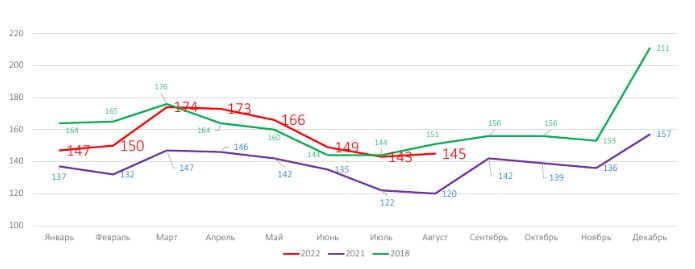 С января по март отпускная цена на шампиньоны в 2022 году была ниже, чем в аналогичный период 2018 года, в силу экономического спада и роста инфляции.