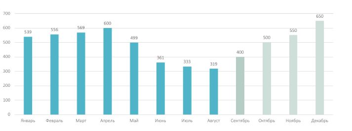 Объем производства вешенки в России составил: в 2020 году – 6115, в 2021 – 6018, 2022 – 6500 тонн. Ежемесячная динамика в 2022 году составляла в среднем 5%, с апреля по август было снижение, также вызванное уходом мелких игроков. Но в последнем квартале 2022 года намечается запуск нового предприятия «Зеленая линия», которое изменит ситуацию на рынке. Объем вешенки заметно увеличится: с 400 тонн – в сентябре до 500 – в октябре, 550 – в ноябре, 650 – в декабре.