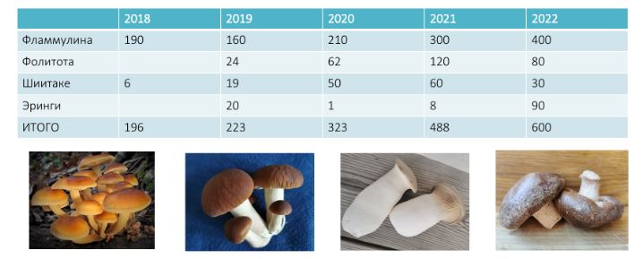 Экзотические грибы производятся в гораздо меньших объемах, чем шампиньоны и даже вешенки. В 2022 году, по данным «Школы грибоводства», было собрано: фламмулина – 400 тонн, фолитота – 80 тонн, шиитаке – 30 тонн, эринги – 90 тонн.