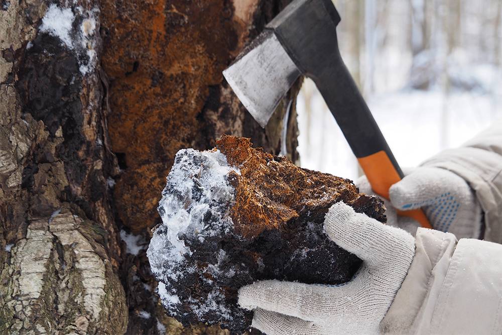 Чагу собирают круглый год, но чаще зимой, когда меньше листвы и гриб легче найти. От дерева его отделяют большим ножом или топором. Удаление склероция не вредит дереву. Напротив, если он не пророс глубоко внутрь, это может спасти березу.