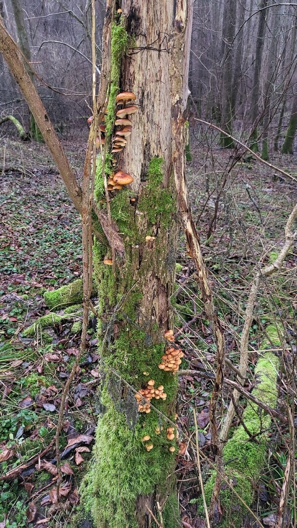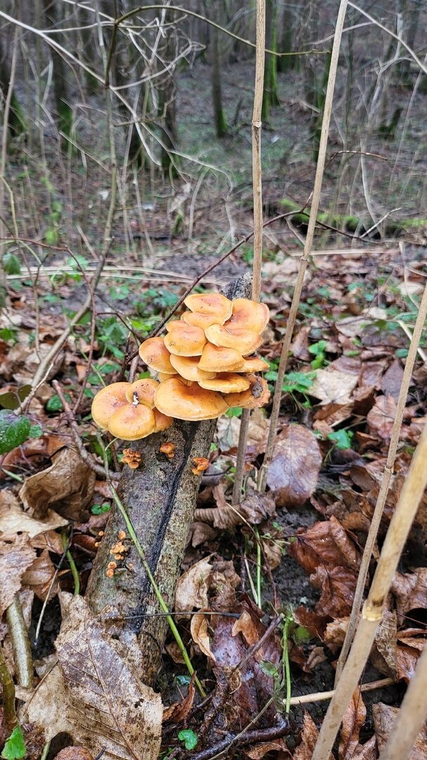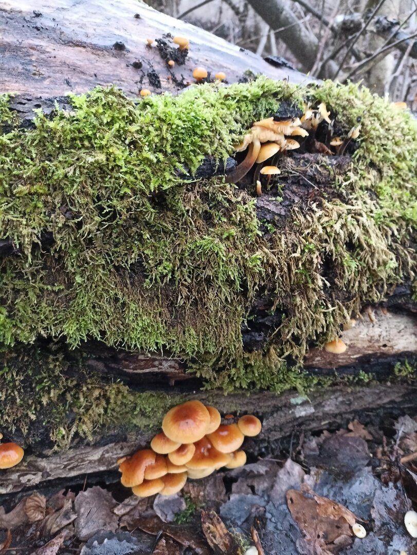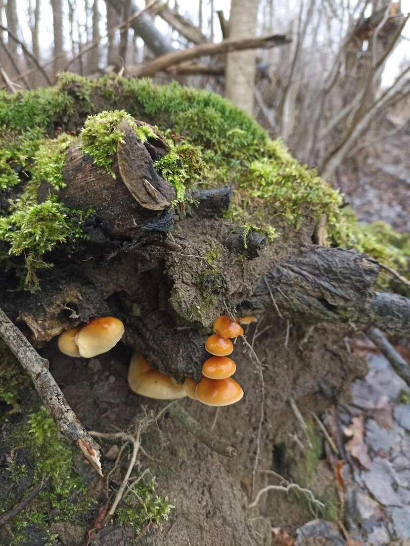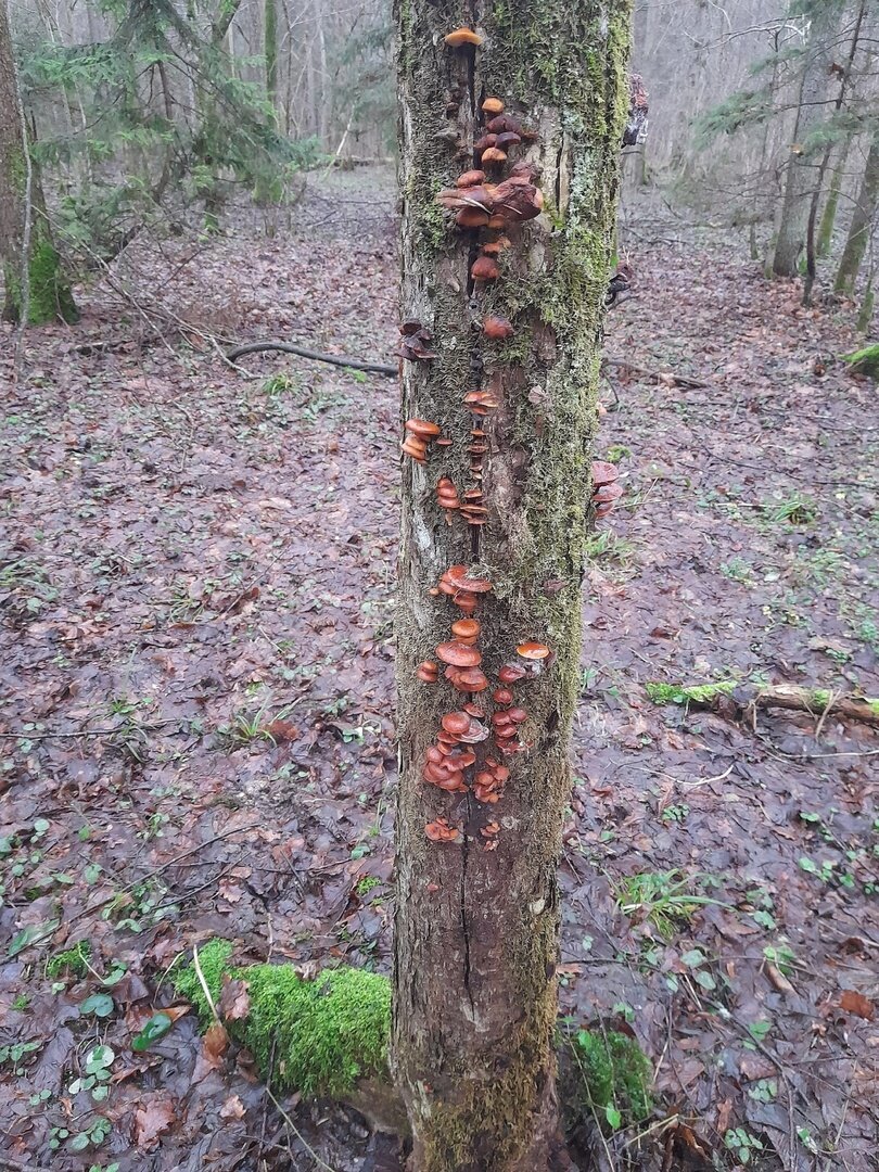 Марина тоже устала сидеть дома и дожидаться сезона: «Доедаешь новогодние салаты и с опаской смотришь в сторону весов… Ни рыбалки, ни грибалки — тоска зелёная. Решили развеяться, погулять по осинникам, поискать зимнего опёнка — фламмулину. Грибок растёт и очень бодренько. Буквально в течение пяти минут были найдены несколько пней с рыжим красавцем».