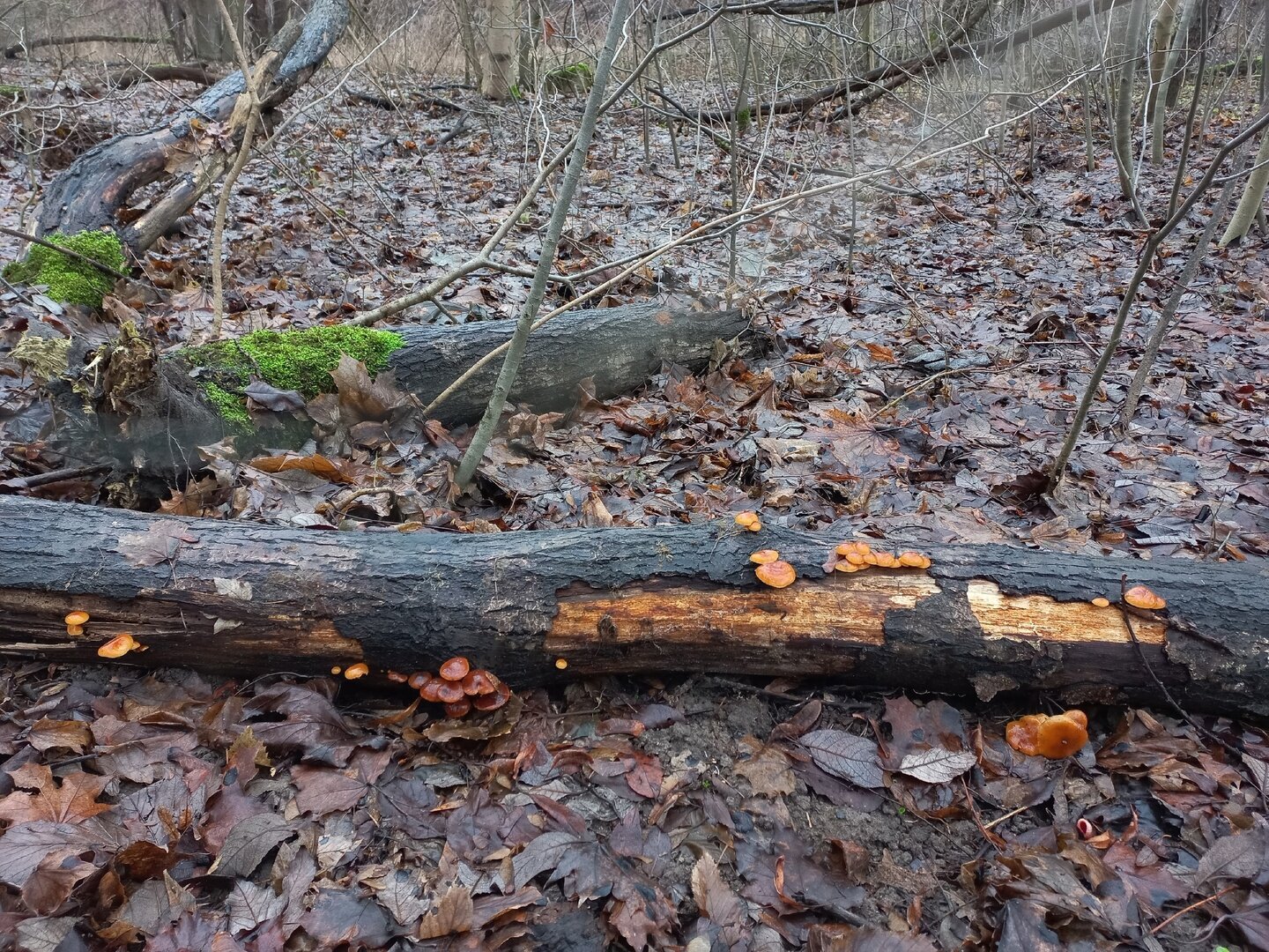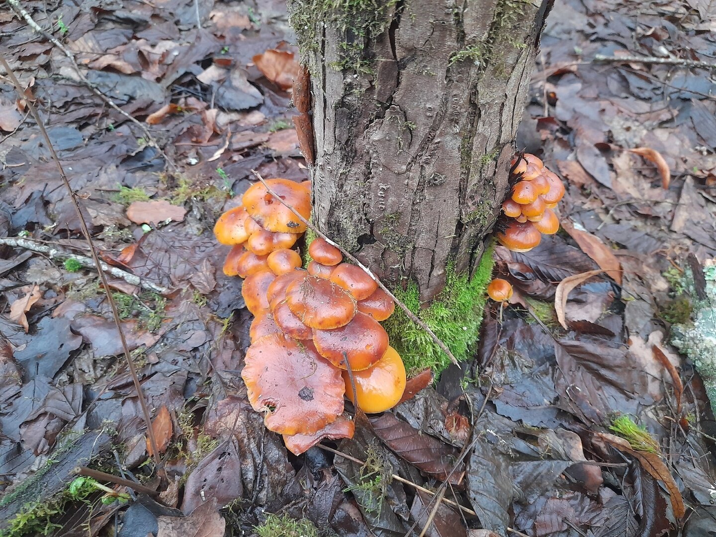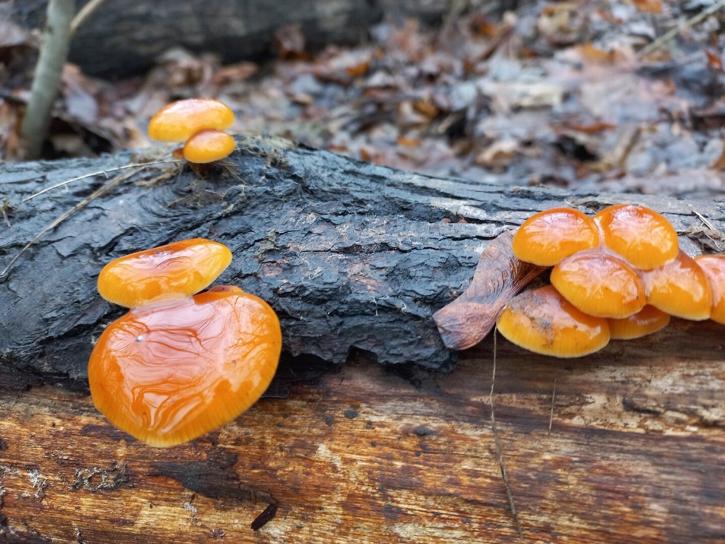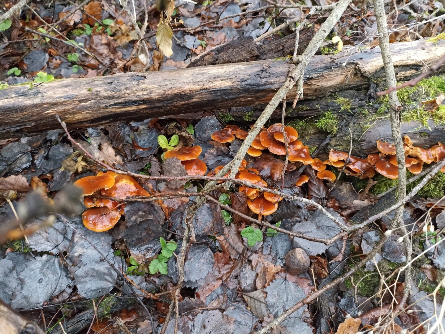 Марина тоже устала сидеть дома и дожидаться сезона: «Доедаешь новогодние салаты и с опаской смотришь в сторону весов… Ни рыбалки, ни грибалки — тоска зелёная. Решили развеяться, погулять по осинникам, поискать зимнего опёнка — фламмулину. Грибок растёт и очень бодренько. Буквально в течение пяти минут были найдены несколько пней с рыжим красавцем».