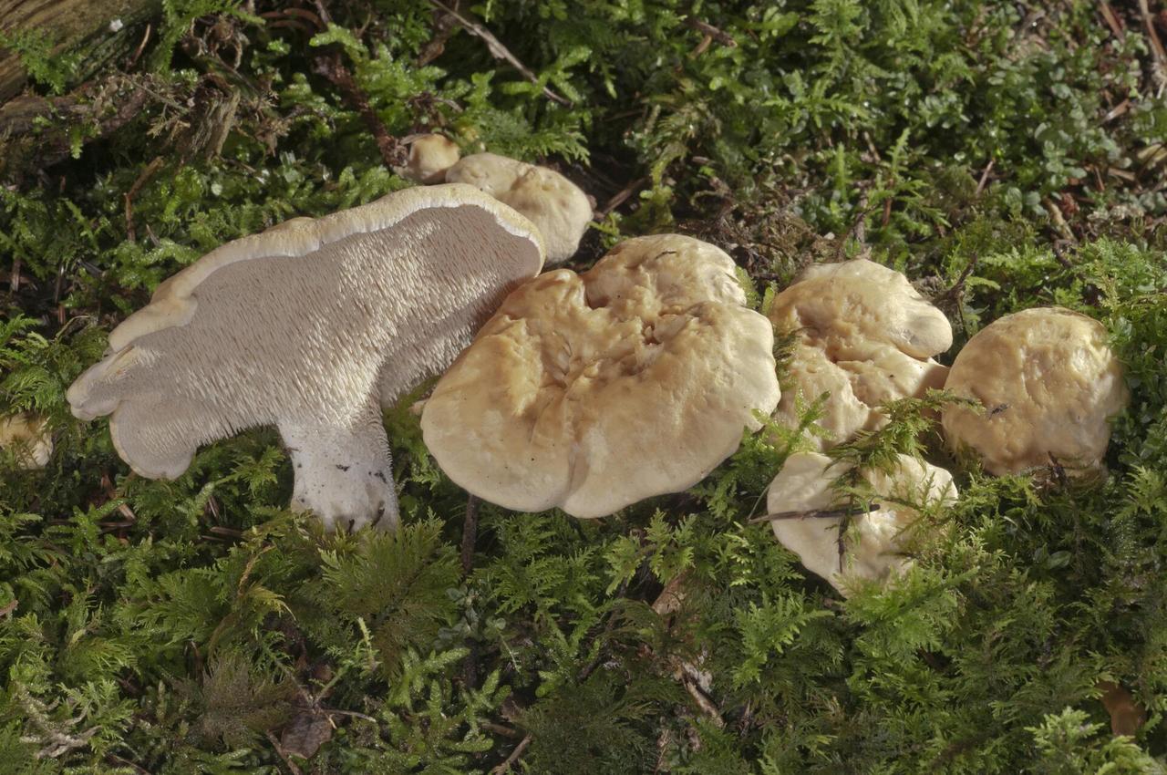 Внешне ежовик желтый похож на лисичку, но вместо пластинок снизу шляпки у него находятся мягкие шипы: благодаря им гриб и получил название.