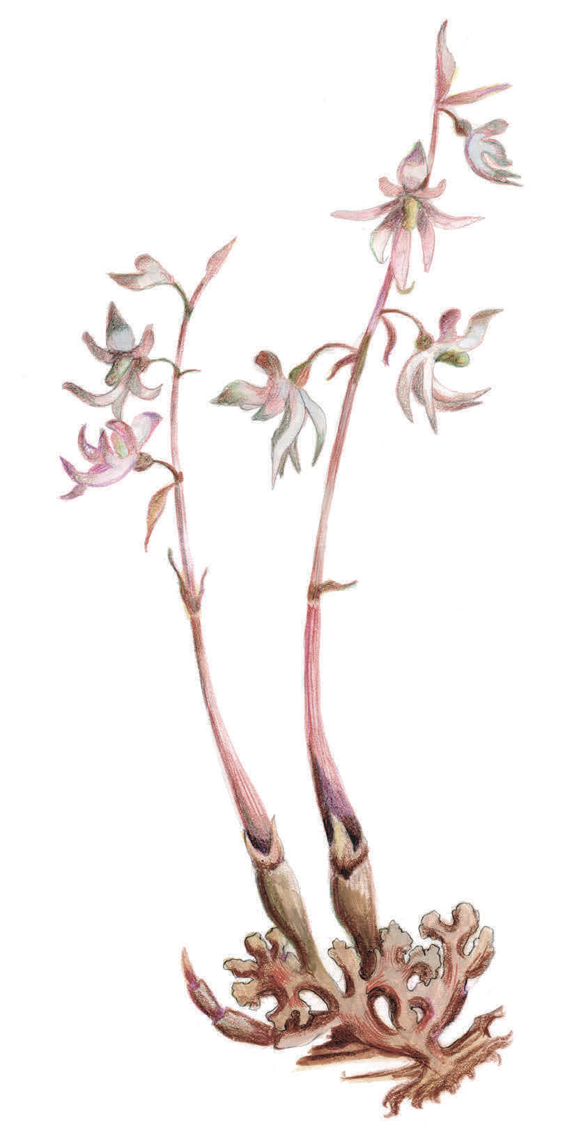 Это многолетнее растение. Большую часть жизни существует в виде подземного корневища с клетками с микоризными грибами, на поверхности появляются только цветоносные побеги. При этом цветоножка изогнута, поэтому и цветки направлены вниз. Лепестки желтоватые, а губа цветка светло-розовая с пурпурным.