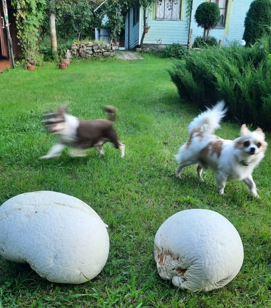 Как оказалось, вес одного островского «рядобуда» 1 килограмм 240 граммов, второй чуток поменьше. Соседские собачонки Беляш и Маша долго не могли понять, что или кто это и долго носились вокруг этих «колобков», пока не успокоились.