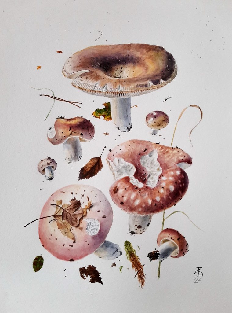 Грибные портреты Александра Вязьменского (СПбМикО). Акварель.Сыроежка пищевая (Russula vesca)