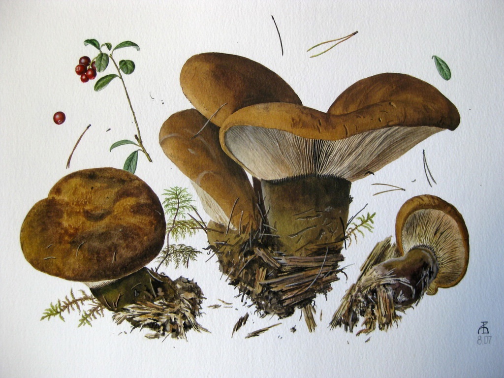 Грибные портреты Александра Вязьменского (СПбМикО). Акварель.Свинушка толстая (Tapinella atrotomentosa)