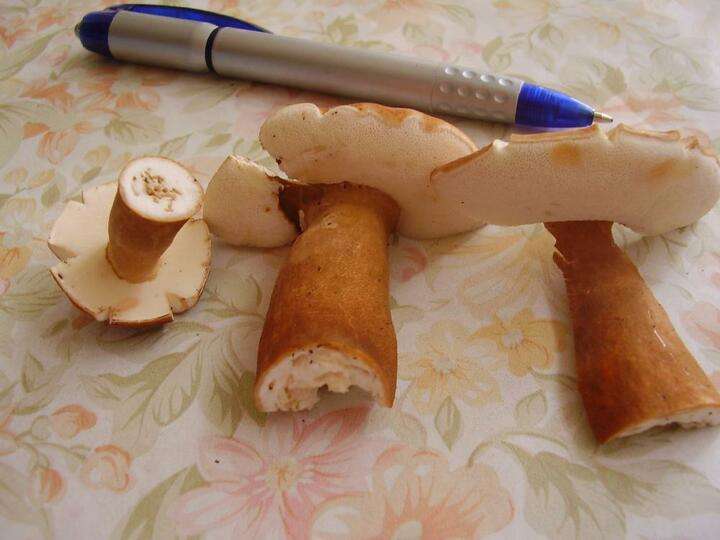Каштановый гриб имеет сходство с белым грибом, но ножка имеет коричневатый цвет и полая либо с пустотами.