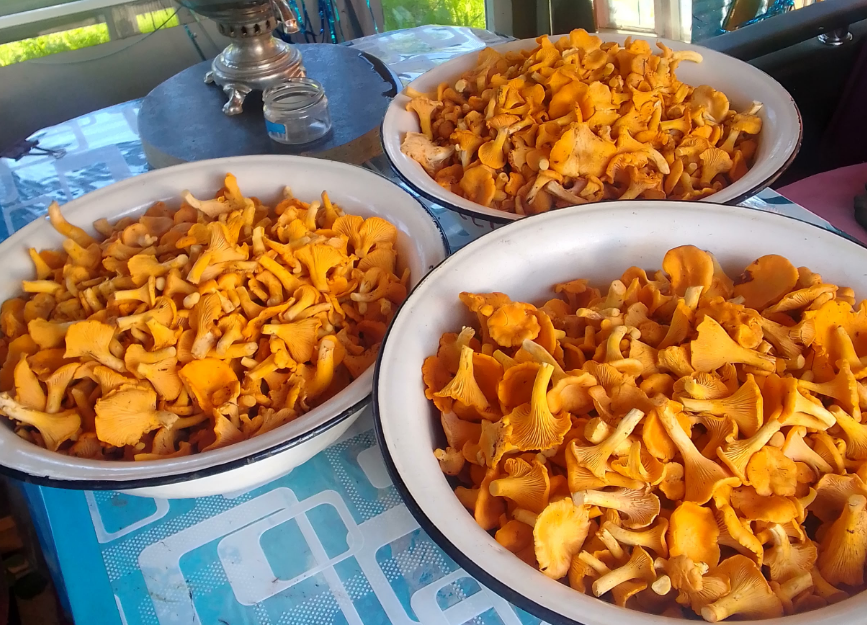 На первом снимке показаны аж целых три тазика, наполненные лисичками. Подписчик отметил, что набрал всё это добро всего за полтора часа.