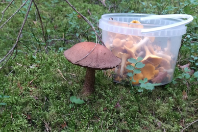 На втором снимке лисичек чуть-чуть поменьше — одно ведёрко, но зато к ним в компанию попал подосиновик.