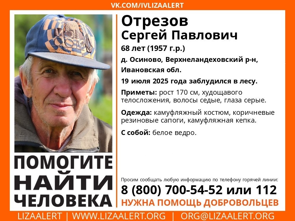 68-летний Сергей Отрезов, житель деревни Осиново Верхнеландеховского района, отправился 19 июля в лес. Пенсионер оделся в камуфляжный костюм, коричневые резиновые сапоги и камуфляжную кепку.