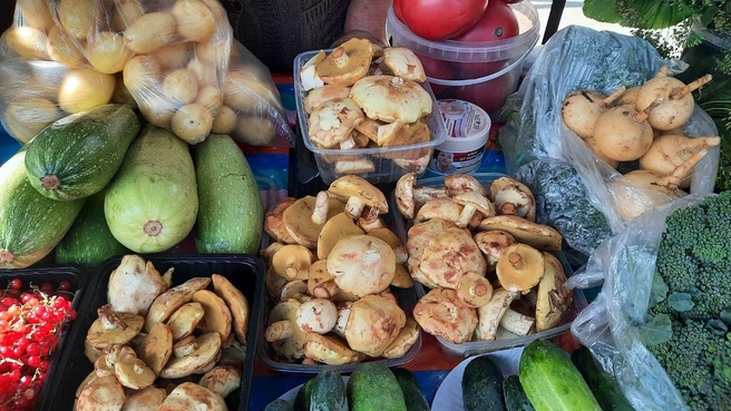 Время других грибочков пока не пришло, но на рынке есть немного маслят. Уже почищенные грибы продают по 250 рублей за контейнер.