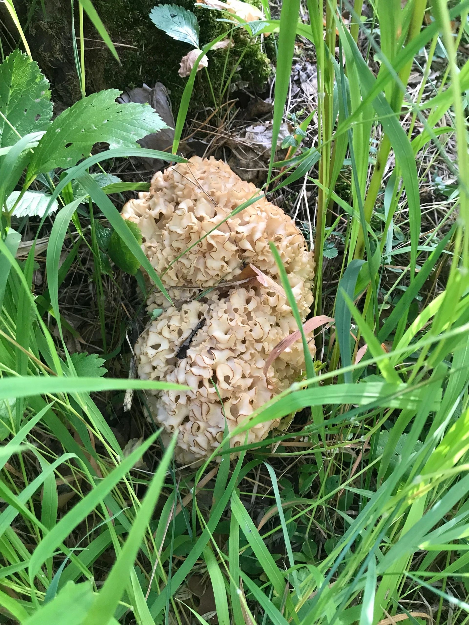 Как позже объяснили в комментариях другие любители «тихой охоты» интересный внешне гриб — Спарассис курчавый, который занесен в Красную книгу России. Иначе его называют «грибная капуста». Он съедобен, однако собирать редкий вид запрещено.