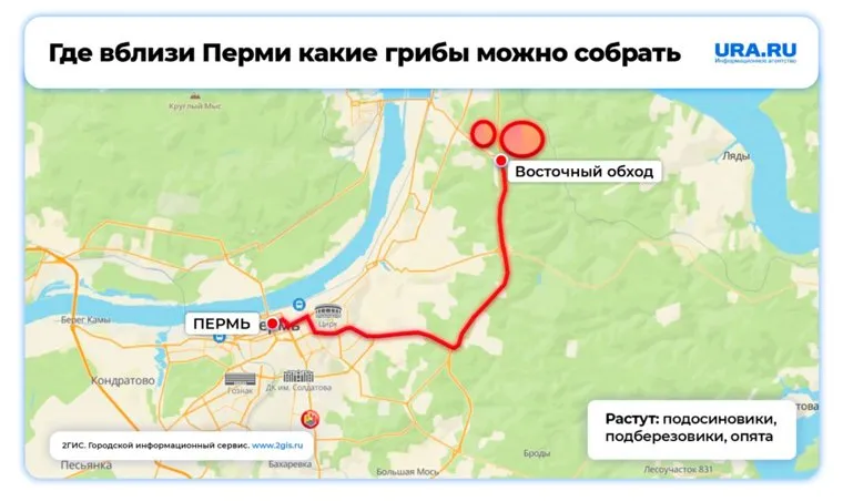 Если не иметь больших амбиций, но очень хотеть грибов, то их всегда можно найти в небольшом количестве на Восточном обходе Перми. Ориентироваться стоит на СНТ «Солнечный». Неподалеку от него с обеих сторон трассы грибники оставляют свои авто и удаляются в лес, откуда возвращаются с уловом подосиновиков и подберезовиков. Здесь же можно найти опята, но растет их не так много, как хотелось бы.
