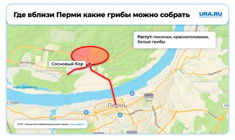 Всего в 17 минутах от центра Перми располагается сосновый бор, который находится рядом с одноименной остановкой по пути в Закамск и на Гайву. Это место популярно не только среди грибников, но и тех, кто просто любит прогулки по хвойному лесу. Здесь растут лисички, красноголовики и даже белые грибы. Конечно, наличие грибов зависит от погоды, но почти всегда из леса никто не уходит с пустыми корзинками.
