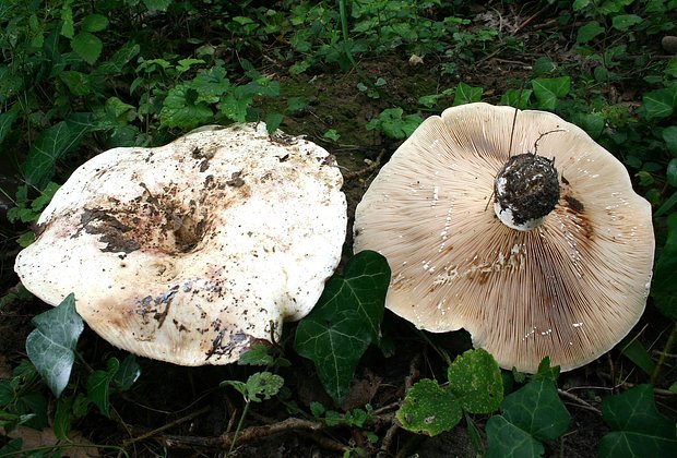 Шляпка: 7-20 сантиметров, вдавленная в центре, цвет от темно-оливкового до желтовато-бурого. Ножка: 3-8 сантиметров в высоту, до 3 сантиметров в диаметре, суженная книзу, того же цвета, что и шляпка. Мякоть: белая, ломкая. Особенности: при разрезании мякоть приобретает серый цвет.