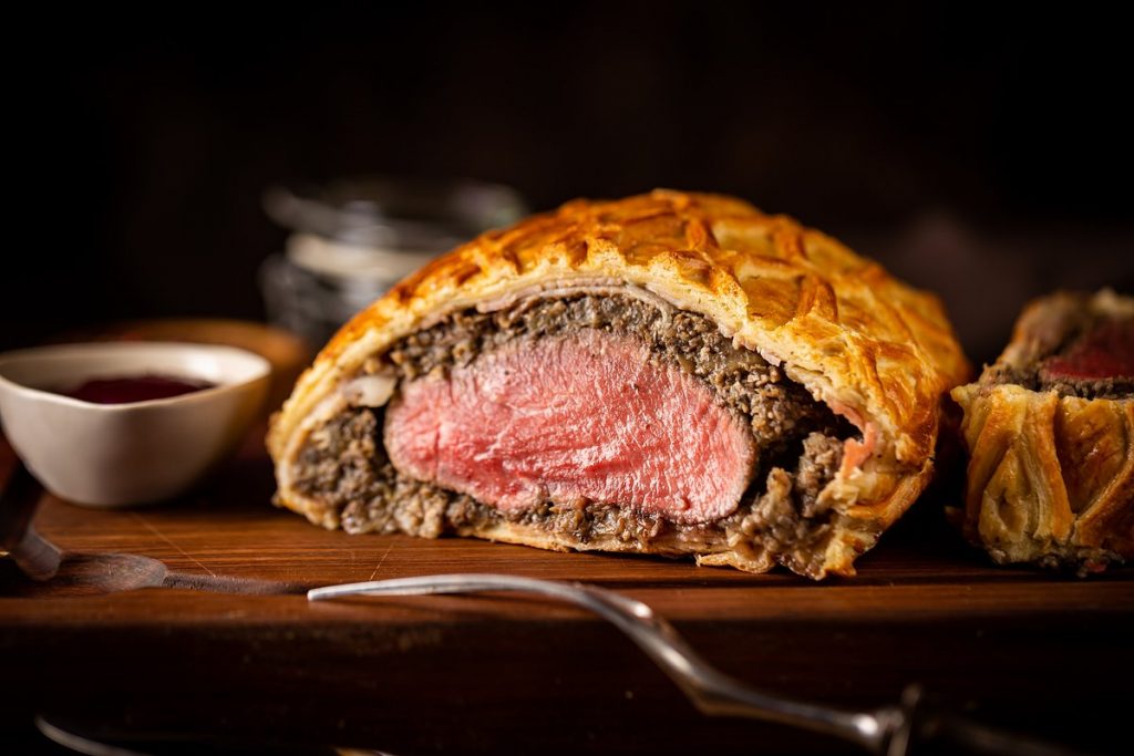 После этого объявления она подала обед: салат, хлеб и главное блюдо — завернутую в слоеное тесто сочную говяжью вырезку с грибной прослойкой