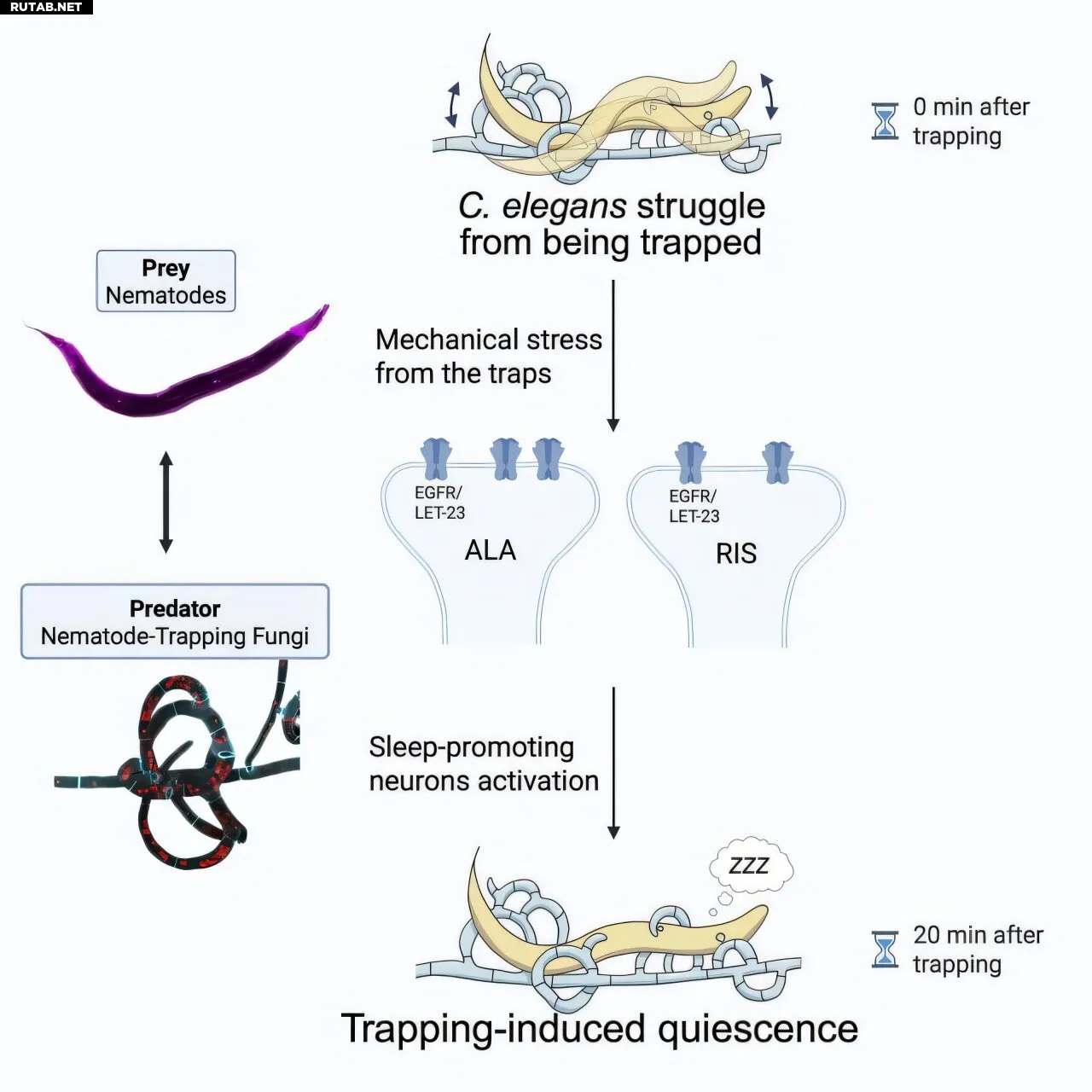 Ученые обнаружили, что данный процесс активирует специфические сомногенные нейроны ALA и RIS в мозге червя. Ключевую роль играют механосенсорные нейроны, которые обнаруживают физическое воздействие ловушки, и сигнальный путь рецептора эпидермального фактора роста (EGFR), известный по другим стрессовым реакциям.