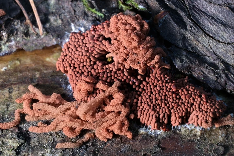 - Какие-то грибы видно невооруженным глазом. Например, слизевик «Арцирия инкарнатная». В созревшем виде она похожа на коралл красного или оранжевого цвета, растет на упавших деревьях. Или «Трихия обманчивая» — грибоподобное существо, которое обладает свойствами как грибов, так и простейших животных, и растет на грающей древесине. Выглядит как россыпь ярких красно-оранжевых бусинок, похожих на ягоды (есть их ни в коем случае нельзя), размером около трех миллиметров. Их, конечно, легко заметить.