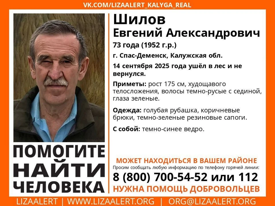 В Калужской области организованы поиски 73-летнего жителя Спас-Деменска. Евгений Александрович Шилов ушёл в лес 14 сентября и не вернулся домой. К поискам подключились правоохранительные органы и добровольцы поисково-спасательного отряда «Лиза Алерт».