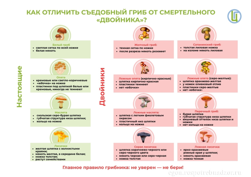 В лесу грибников тоже ждёт немало неприятных сюрпризов. Съедобные боровики, опята, маслята и лисички легко спутать с их смертельными двойниками. Отличия — в цвете шляпки и мякоти, толщине ножки, наличии или отсутствии «юбочки», следует из инфографики Роспотребнадзора.