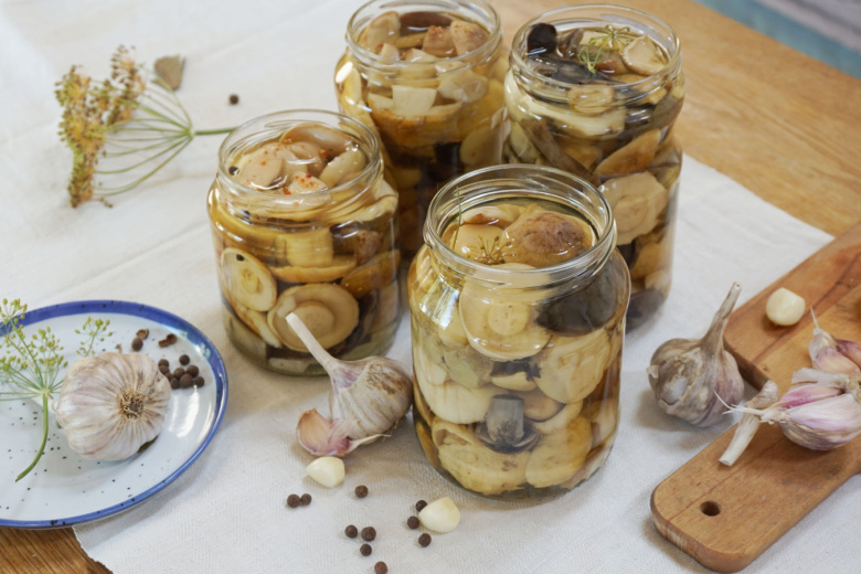 На дно простерилизованных банок из стекла или керамики помещаются пряности: душистый перец горошком, ароматная гвоздика, лавровый лист, свежий укроп и чеснок. Остывшие грибы аккуратно укладываются шляпками вниз, пересыпаясь смесью соли и щепотки сахара. Для придания пикантной нотки добавьте тонкие дольки лимона, предварительно удалив из них семена.