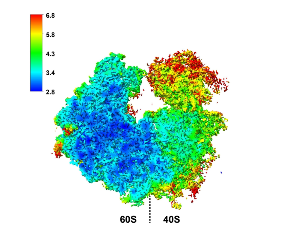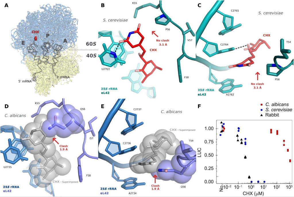 Затем ученые сосредоточились на изучении рибосомы грибка — «мозгового центра», где синтезируются белки. Авторы впервые определили структуру рибосомы Candida albicans и выяснили, почему она устойчива к антибиотику циклогексимиду. Оказалось, причина в замене точечной мутации P56Q в рибосомном белке eL42: глутамин «выталкивает» соединение из участка рибосомы, отвечающего за освобождение отработанных компонентов.