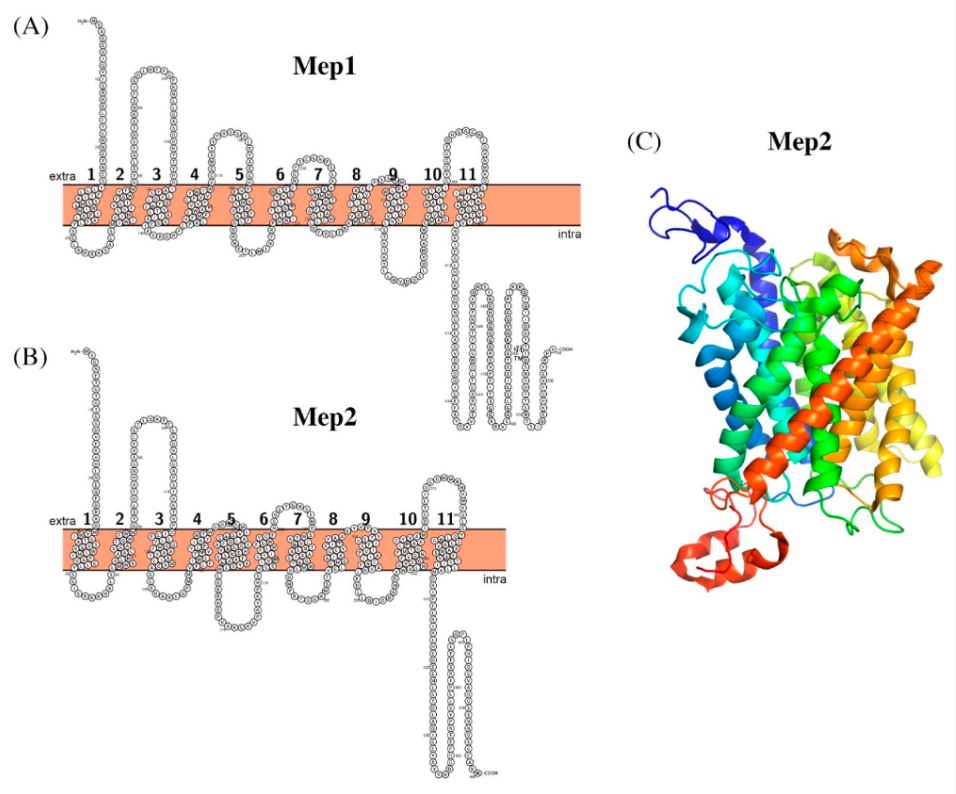 Схематическое изображение вторичной структуры Mep1 (A) и Mep2 (B). Кристаллическая структура Mep2 Candida albicans (C);