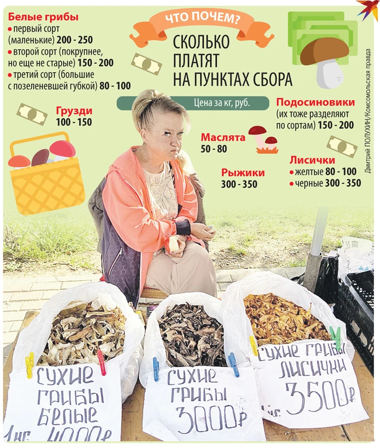 - То, что денег за это дают немного. Поэтому важны объемы. В сезон сборщик уходит в лес на весь день — от восхода до заката. Набирает по максимуму. Если год грибной, то за день реально набрать 150 кило. Допустим, у вас только белые грибы. В среднем цена будет по 200 рублей за килограмм. Итого — 30 тысяч в день. Поэтому в дальних деревнях, где работы практически нет, люди семьями уходят в лес на сборы. За два месяца можно хорошо заработать.