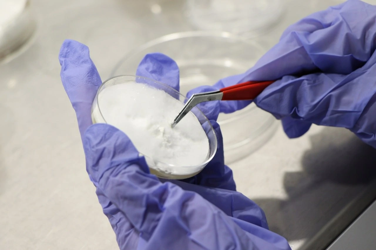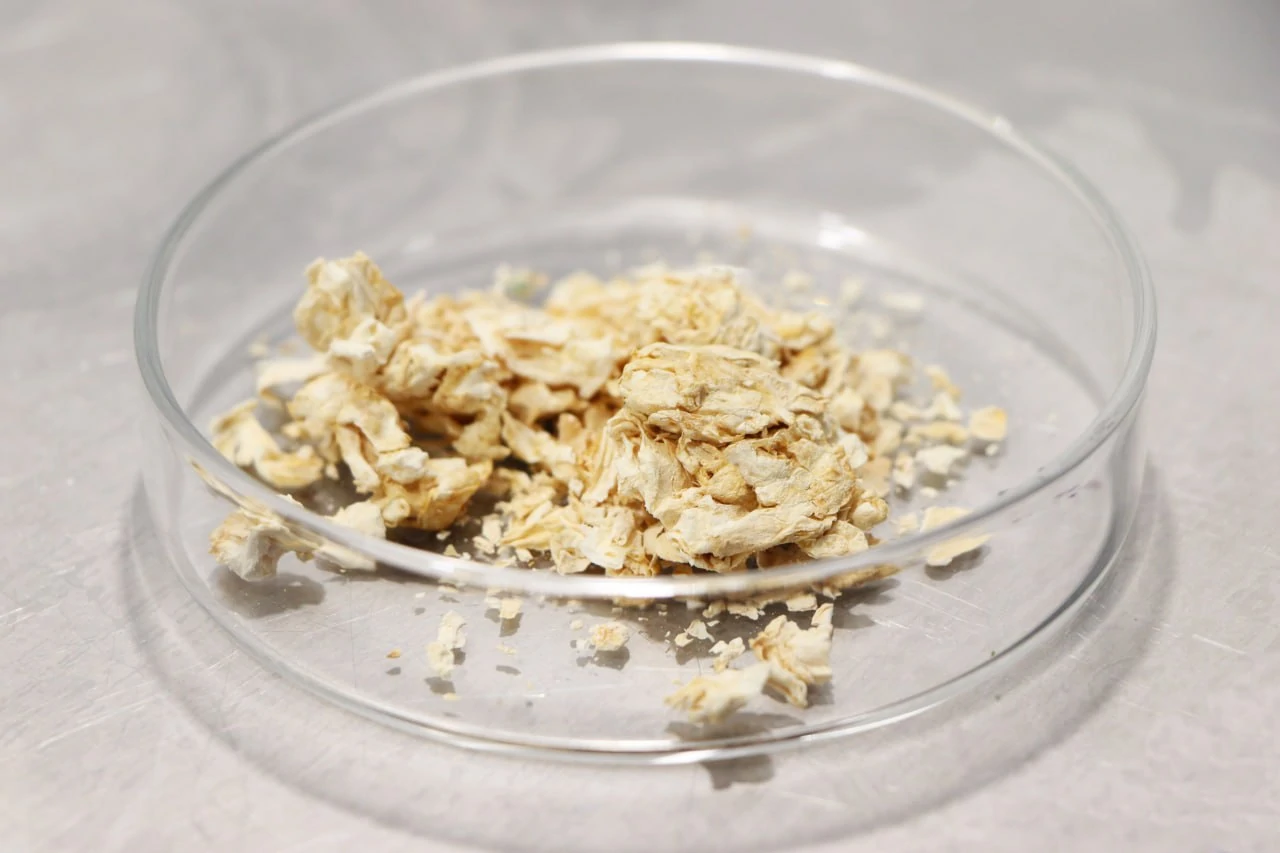 Как происходит процесс? Политехники подготавливают посевной материал штамма гриба и культивируют его на питательной среде. Затем биомасса мицелия отделяется с помощью фильтрации и высушивается. В результате получается белковая биомасса с высоким содержанием протеина и физиологически активных веществ.