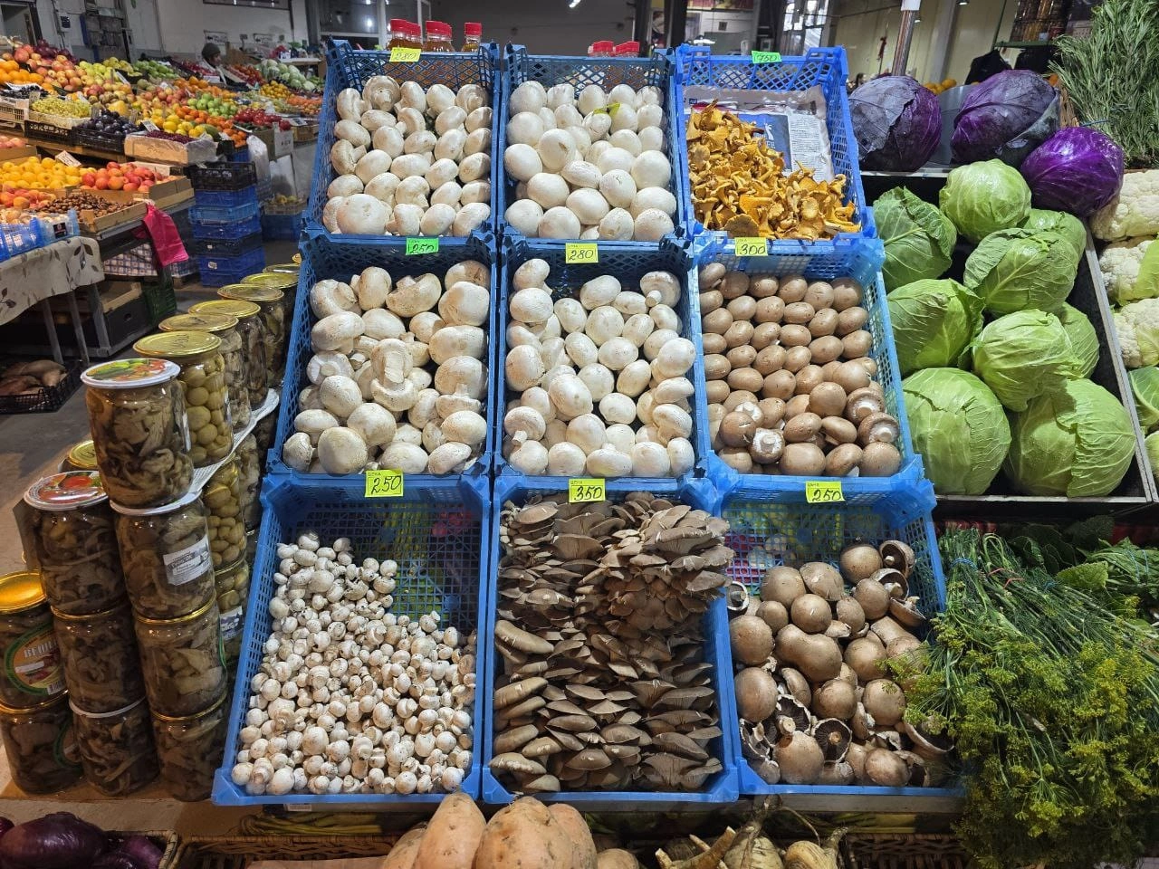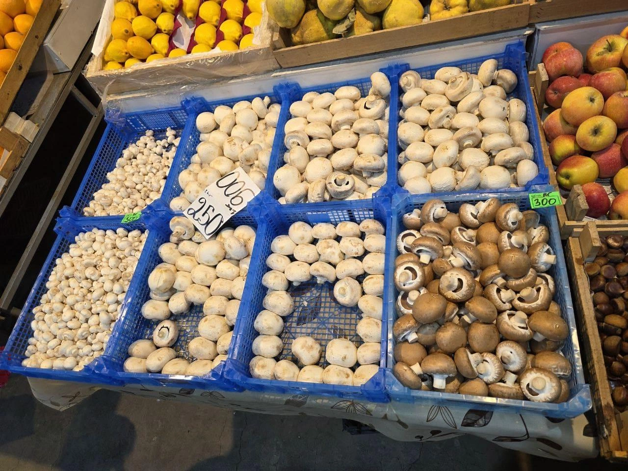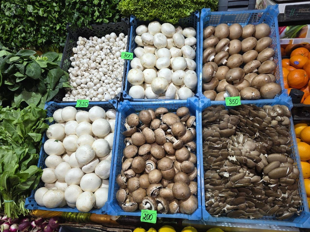 На рынке представлен большой выбор шампиньонов. Здесь можно найти и мелкие, и классические белые шампиньоны, и королевские (коричневые) разных размеров.