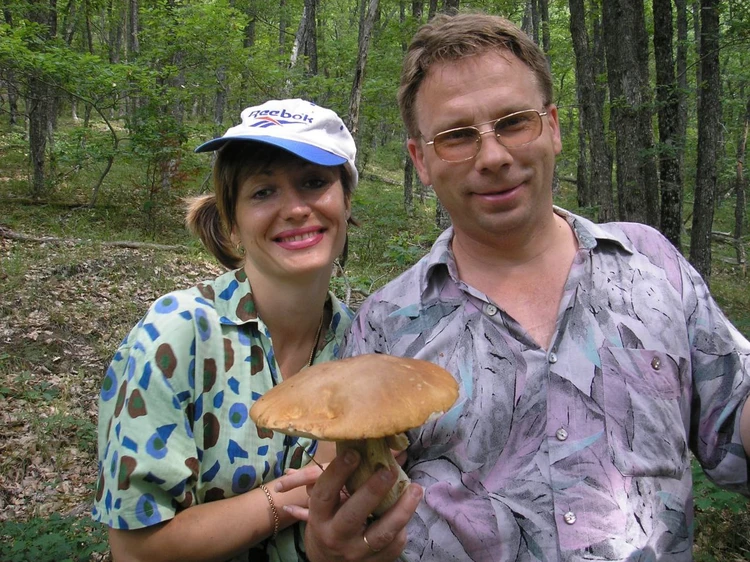 Наталья Широких с супругом. В руках белый гриб. Фото: Из семейного архива Широких