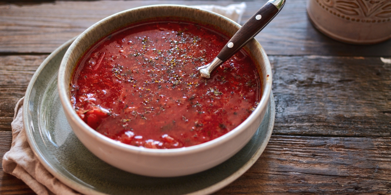 Все ингредиенты этого борща обжариваются и солятся по очереди и потом отправляются в кастрюлю. Кипяченую воду в кастрюлю лучше вливать постепенно, по мере закладывания каждого ингредиента. Последовательность действий важна. Нам понадобятся: говяжья грудинка с жиром и хрящами, морковь, лук, капуста, свекла, маринованные рыжики. Обжариваем грудинку, отправляем ее в кастрюлю с кипящей водой. В этом же жире обжариваем по очереди морковь, лук, капусту, свеклу, рыжики. Один ингредиент обжариваем, отправляем в кастрюлю, на его место приходит другой. То есть всё жарится на сковородке и жире от предыдущих обжарок. Перед обжаркой рыжиков добавляем лавровый лист, перец и крупно нарезанный чеснок. Через пять минут после варки рыжиков — кинзу и свежую черемшу. Выключаем огонь, даем борщу полчаса настояться под крышкой. Можно добавить лимонный сок.