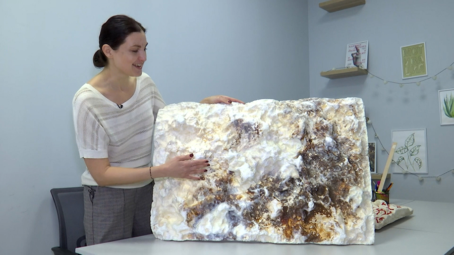 Автор мраморных переливов — из загадочного царства живой природы. И всё ещё удивляет учёных. «Многие думают, что это плесень, но это не так. Вся плесень — это грибы, но не всё, что грибы, есть плесень. Это грибы особенные, я не могу называть, какие они, потому что у нас режим ноу-хау», — говорит основатель компании по выращиванию мебели и строительных материалов из грибов Дарья Токарева.