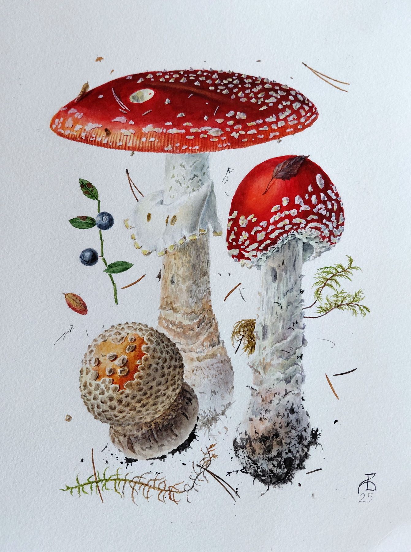 Грибные портреты Александра Вязьменского (СПбМикО). Акварель. Мухомор красный (Amanita muscaria)