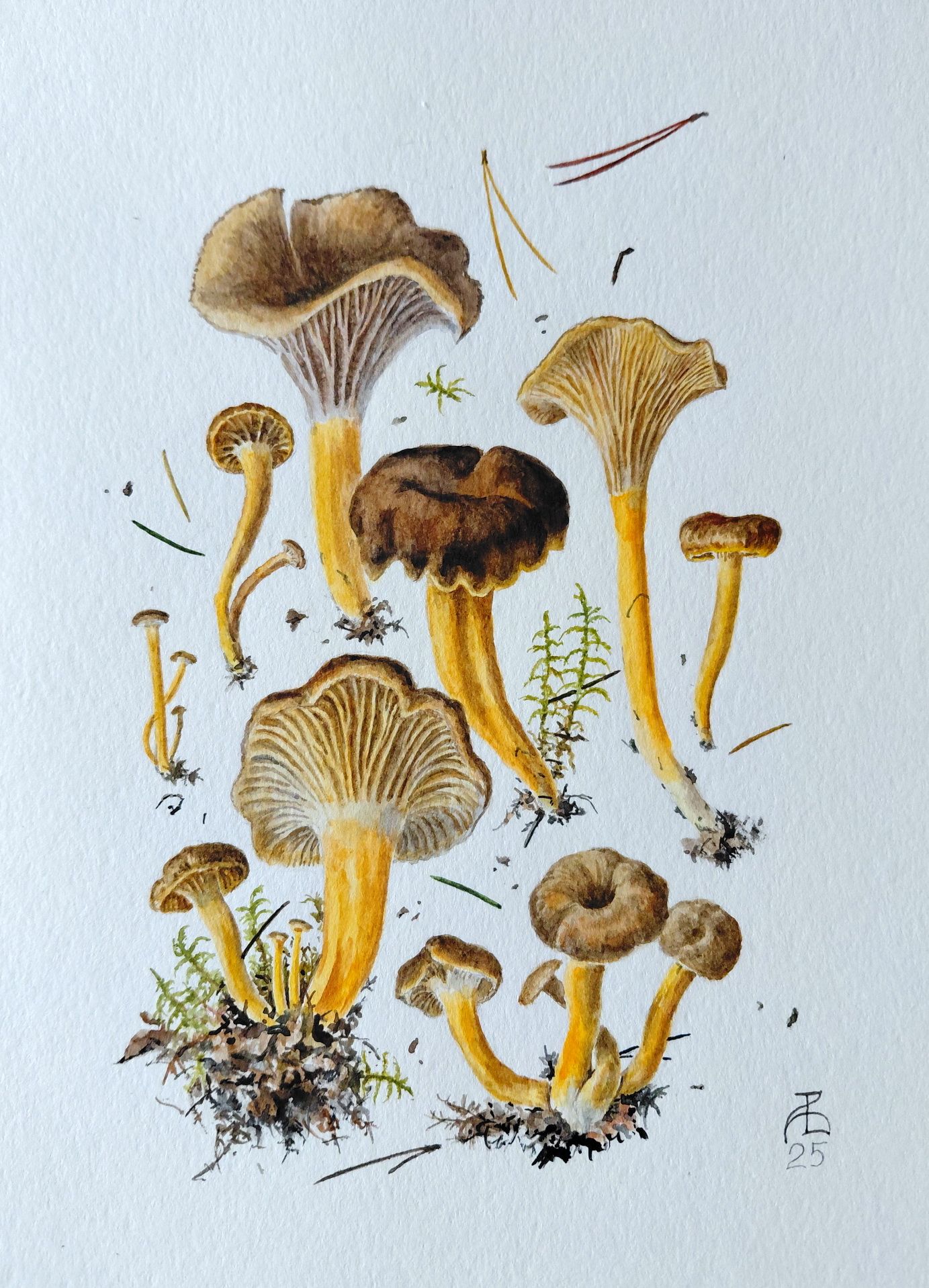 Грибные портреты Александра Вязьменского (СПбМикО). Акварель. Лисичка ворончатая — Craterellus tubaeformis