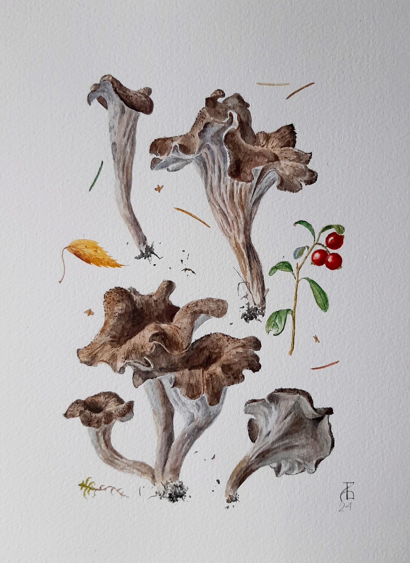 Грибные портреты Александра Вязьменского (СПбМикО). Акварель.Вороночник рожковидный — Craterellus cornucopioides