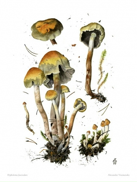 Грибные портреты Александра Вязьменского (СПбМикО). Акварель.Ложноопёнок серно-жёлтый (Hypholoma fasciculare).