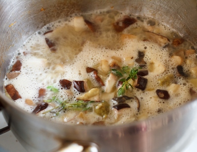 Вливаем бульон, добавляем тимьян, доводим до кипения. Варим 15 минут.