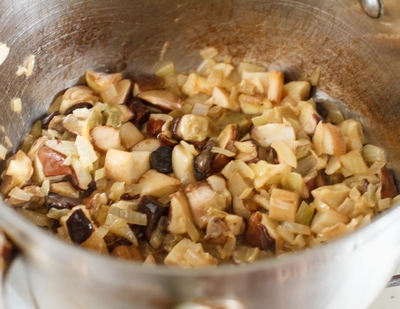 В кастрюле на среднем огне растапливаем сливочное масло. Кладем лук и жарим, помешивая, 3-4 минуты.