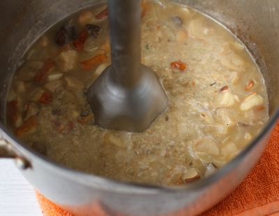 Снимаем кастрюлю с огня и измельчаем суп блендером до как можно более гладкого состояния. При желании можно протереть суп через сито.