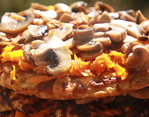 Давным-давно, когда нас еще не было на свете, в еврейских местечках на Украине уже готовили на праздник Суккот этот кабачковый пирог. Наверное, тогда его обжаривали не на оливковом, а на пахучем подсолнечном масле. И в качестве начинки использовали не шампиньоны, а обычные грибы, выросшие в соседнем лесу. Но суть была той же, что и сейчас. Пирог он и есть пирог, из чего бы ни делался: из бисквита с вареньем или из кабачковых оладушек размером с целую сковороду, моркови и грибов.