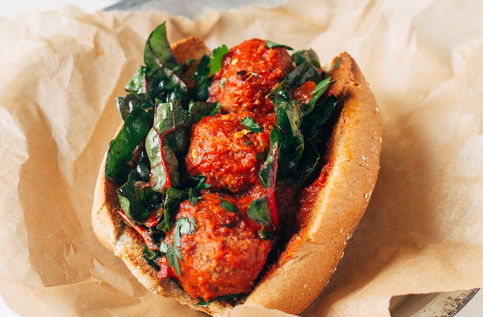7. В ту же сковороду добавьте томатный соус и готовьте с чесноком на маленьком огне. В сковороду переложите готовые фрикадельки. Поместите фрикадельки и листья свеклы в центр разрезанной булочки, притрусите петрушкой и хлопьями перца чили.