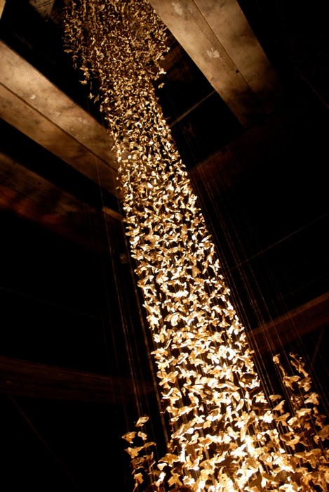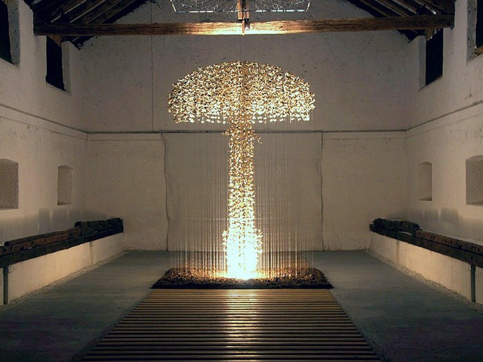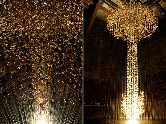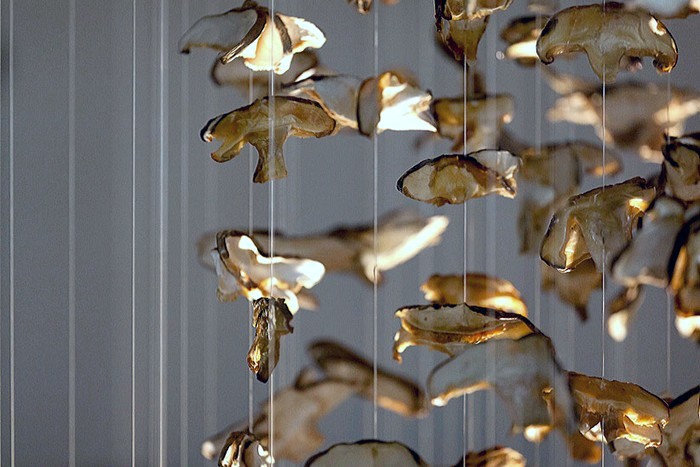 Инсталляция Mushroom Cloud не просто так имеет форму ядерного гриба: она в буквальном смысле этого слова состоит из грибов. Художнику-концптуалисту Крису Друри потребовалось нанизать на нитки от 6000 до 18000 кусочков высушенных и покрытых акриловой краской грибов, чтобы затем развесить вязанки в нужном порядке, придав полотну нужную форму. Похоже, висящие в воздухеинсталляции становятся популярным трендом современного искусства.