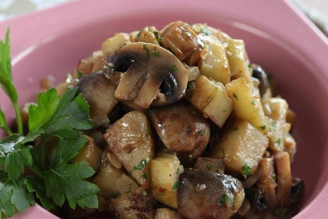 Грибы очистить, вымыть и крупно нарезать. Поместить в сотейник, влить 1 стакан воды и готовить, пока вся жидкость не выпарится. Добавить 2 ст. л. масла и продолжать готовить еще 6 мин. Лук измельчить и обжарить на 1 ст. л. масла. Баклажаны очистить от кожицы и порубить на небольшие кусочки. Добавить к луку, влить оставшееся масло и готовить под крышкой на среднем огне 10 мин. Добавить в сотейник грибы и чеснок, влить 2—3 ст. л. горячей воды и готовить еще 15 мин. Снять с огня. Добавить петрушку, уксус, соль и перец. Перемешать и дать остыть.