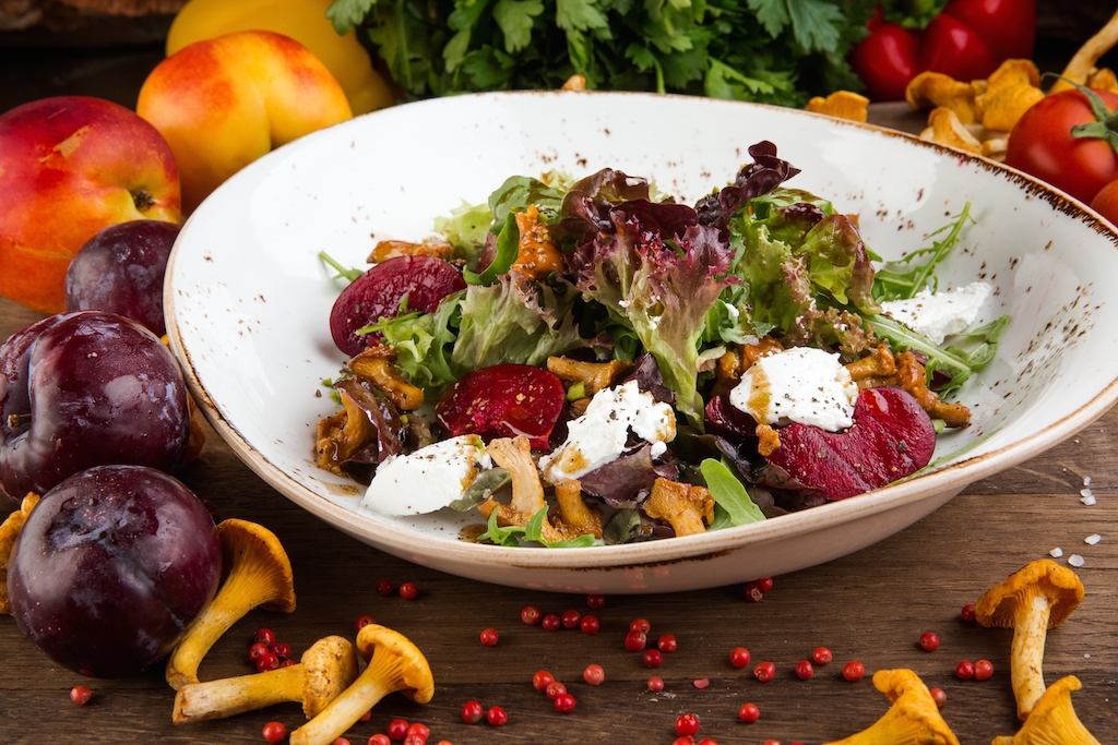 Ингредиенты: 100 г лисичек, 50 г мангольда, 4–5 слив, 1 ч.л. бальзамического уксуса, 1 ч.л. меда, 2 ст.л. оливкового масла, 2 ст.л. маскарпоне, 1 ч.л. сахара