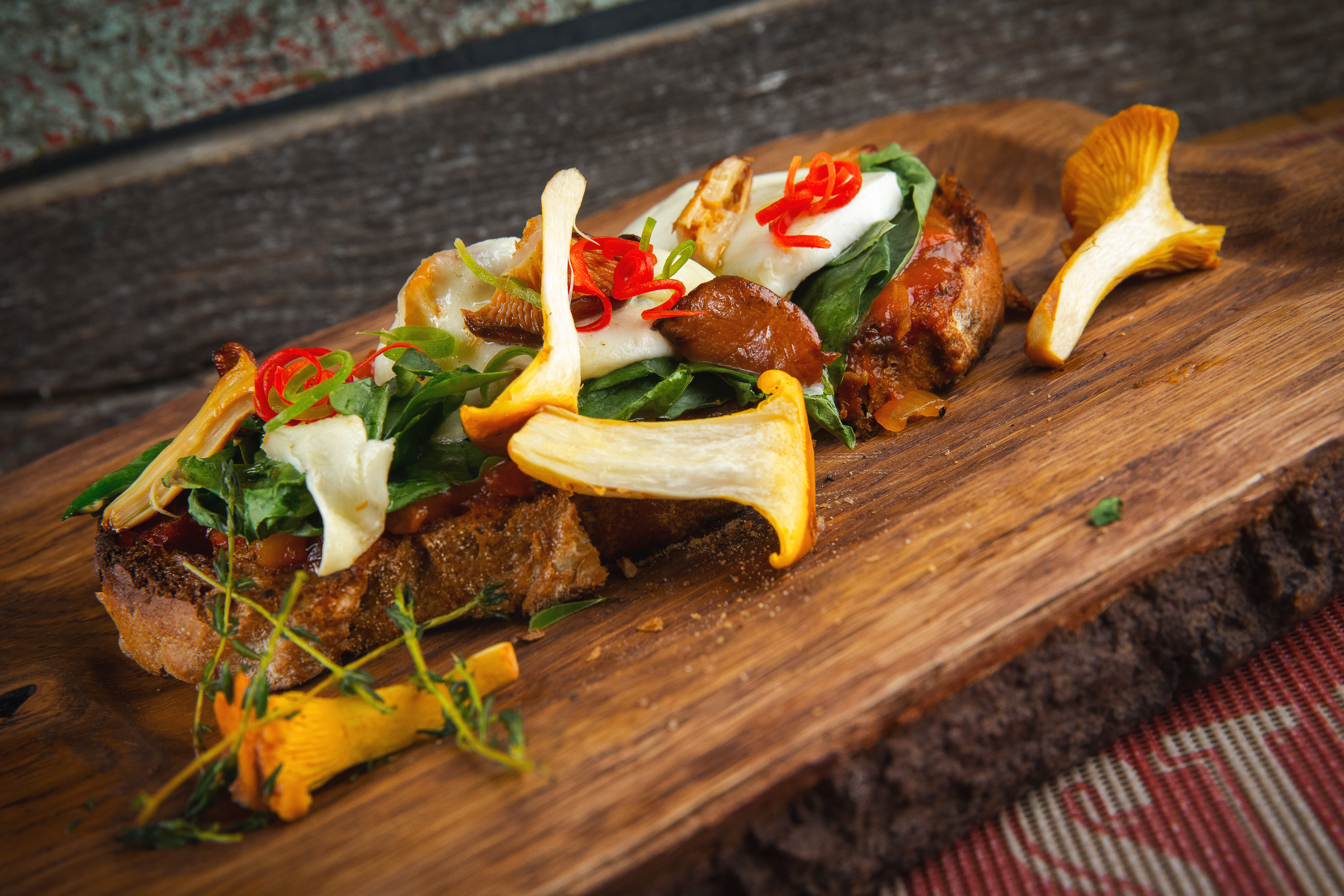 Ингредиенты: хлеб для брускетты, шпинат свежий, сыр моцарелла, грибы лисички свежие, перец черный молотый, сок лайма, соль. Для соуса: помидоры свежие, помидоры в собственном соку, листья мяты, сахар, соль, оливковое масло