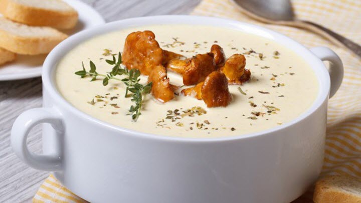 Ингредиенты: 500 г лисичек, 300 мл сметаны 20%, 30 г сливочного масла, 6 средних картофелин, зелень, соль.
